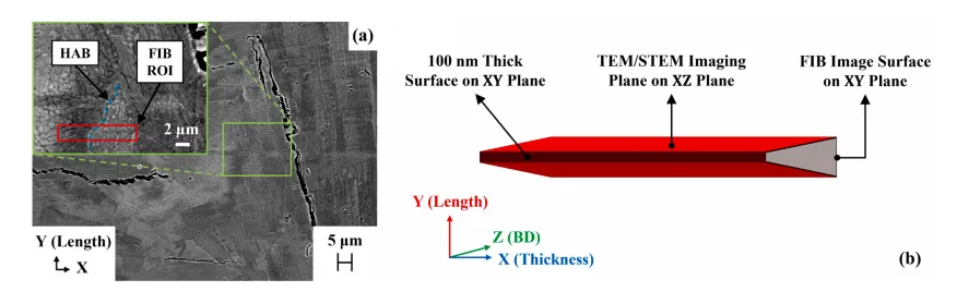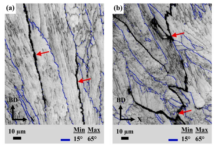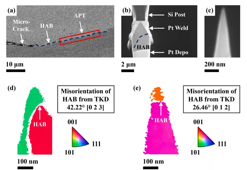 图1. (a) 用于制备 R65 和 R108 薄壁构件的激光粉末床熔融工艺参数。(b) 基板上薄壁零件的三维计算机辅助设计图。 采用 Aconity™ MIDI 激光 3D 打印机,在不同成型基板上分别制备了两种合金的薄壁试样(每种合金各 1 件),成型工艺参数如图 1a 所示。图 1b 为成型基板上薄壁试样的三维计算机辅助设计(CAD)示意图。打印采用双向扫描策略,扫描方向与试样壁厚方向(沿 X 轴)呈 15° 夹角;试样摆放方向与铺粉方向呈 45°,以避免打印方向与铺粉器运动方向垂直。 图2. (a) R108 合金的扫描电镜图像,插图(绿色框)显示微裂纹附近用于聚焦离子束制样的目标区域(红色框,ROI)。(b) 聚焦离子束制样后,薄试样 XZ 面的透射电镜 / 扫描透射电镜表征区域示意图。注:Z 方向与成形方向(BD)一致。 为观察包含成型方向(BD)的 XZ 平面显微组织,采用配备牛津 Xplore 透射电镜 X 射线能谱(EDX)探测器的日本电子 JEM 2100F 场发射透射电子显微镜开展测试,在 200 kV 工作电压下分别以常规透射电镜模式和扫描透射电镜(STEM)模式进行分析。同时采用可控倾转技术和选区电子衍射(SAED)花样,对显微组织中的不同区域进行区分,并识别 γ' 析出相。 图3. (a) 镓离子束成像图,含微裂纹尖端前方的大角度晶界(深蓝色虚线),红色矩形标注出目标原子探针层析成像区域。(b) 环形铣切制样装置示意图,聚焦离子束制样薄片通过铂焊接固定在硅柱上。(c) 经环形铣切得到的针状试样形貌,大角度晶界位于试样尖端。(d) R65、(e) R108 的透射菊池衍射大角度晶界识别图谱 为保证成分定量分析的可重复性,利用配备镓离子源的赛默飞世尔 Helios 5 UC 聚焦离子束仪,在每种合金的微裂纹尖端前方确定两个目标大角度晶界;通过赛默飞世尔 Helios G4 双束等离子体聚焦离子束仪完成标准的试样提取操作,将提取的试样薄片固定在磨尖的钨丝上,手动旋转 90° 使大角度晶界呈水平状态,随后将其置于法国 CAMECA 公司预制的硅微尖试样座上。再将试样薄片切割成独立小段,通过铂焊接固定在硅柱上。 图4.成形态 R65 和 R108 薄壁构件相关表征曲线:(a) 裂纹总面积占比与裂纹数密度;(b) 裂纹平均长度与平均宽度;(c) 不同偏心率下的裂纹面积占比分布。偏心率值越接近 0,裂纹形态越圆润;偏心率值越接近 1,裂纹形态越平直。 从 R65 到 R108,随合金成分变化,两种合金的裂纹面积分数和裂纹数密度均呈上升趋势。R108 合金裂纹面积分数的波动幅度较大(图 4a),这一现象归因于不同层面的微裂纹倾向存在差异。图 4c 为 R65 和 R108 合金的裂纹面积分数随微裂纹偏心率的分布规律。两种合金的裂纹面积分数分布特征相似,且微裂纹倾向均随偏心率增大而升高。但在所有偏心率区间内,R108 合金的裂纹面积分数均更高,且波动幅度更大。 图5. 250 倍二次电子扫描电镜(SE-SEM)图像:(a) 成形态 R65、(b) 成形态 R108 的微观组织。微裂纹按低偏心率(黑色标注)、高偏心率(红色标注)区分标识。 图 5 为 R65 合金(图 5a)和 R108 合金的 250 倍低倍二次电子扫描电镜(SE-SEM)显微照片(图 5b)。两种合金中均同时存在高偏心率微裂纹与低偏心率微裂纹。高偏心率微裂纹出现频次更高,形貌更平直,且沿成型方向分布;低偏心率微裂纹出现频次更低,形貌更呈锯齿状(拉链状),且沿熔池边界分布。 图6. 5000 倍背散射电子扫描电镜(BSE-SEM)显微图像:(a) R65、(b) R108 中高偏心率微裂纹典型形貌,其偏心率值介于 0.99 至 1 之间。 图 6 为高偏心率微裂纹的 5000 倍高倍背散射电子扫描电镜(BSE-SEM)显微照片。R65 合金(图 6a)和 R108 合金(图 6b)的微裂纹均沿成型方向分布,裂纹表面呈现枝晶状形貌;与 R65 合金相比,R108 合金枝晶间区域存在更多细小的球形颗粒。两种合金的裂纹边界处均未观察到颗粒聚集现象。 图7. 电子背散射衍射取向分布图:(a) 成形态 R65 中高偏心率微裂纹、(b) 成形态 R65 中低偏心率微裂纹的晶间取向差分布。 图 7a 为两种合金含两条平直(高偏心率)微裂纹区域的电子背散射衍射(EBSD)取向差分布图。该图显示,平直微裂纹沿取向差角大于 15° 的大角度晶界扩展,这类晶界是微裂纹的优先扩展路径。 图8. 5000 倍背散射电子扫描电镜(BSE-SEM)显微图像:(a) R65、(b) R108 中低偏心率微裂纹典型形貌,其偏心率值小于 0.99。 图 8 为低偏心率微裂纹的 5000 倍背散射电子扫描电镜(BSE-SEM)显微照片。R65 合金(图 8a)和 R108 合金(图 8b)的微裂纹均沿熔池边界分布,裂纹表面均呈现枝晶状形貌。R108 合金中的细小胞间颗粒较 R65 合金更为明显,且两种合金的裂纹边界处均未观察到颗粒聚集现象。 图9. 透射电镜图像展示平行于成形方向的 R65 胞状微观组织:(a) 5000 倍、(b) 10000 倍。(c) 对 (b) 中红色方形区域的能谱分析结果,呈现晶胞边界附近部分析出相的成分。 图 9a 为 R65 合金的典型透射电镜图像,可见柱状枝晶(胞状晶)。借助选区电子衍射花样可区分胞晶界与大角度晶界(见图 10)。高倍观察发现,胞晶界附近存在少量极细的球状颗粒。成分分析结果表明,该类颗粒富含铝、钛、锆、铌、碳、氧元素,而镍、铬、钨、钴、铁等基体强化元素含量偏低(图 9c)。由于碳、硼的原子序数低且含量微少,其信号易被其他基体元素吸收,因此在扫描透射电镜 X 射线能谱分析中未检测到这两种元素。 图10. 拼接透射电镜图像:展示 R65 合金微裂纹附近平行于成形方向的大角度晶界,附区域 1(R1)和区域 2(R2)的选区电子衍射花样