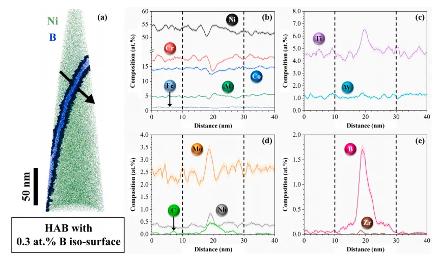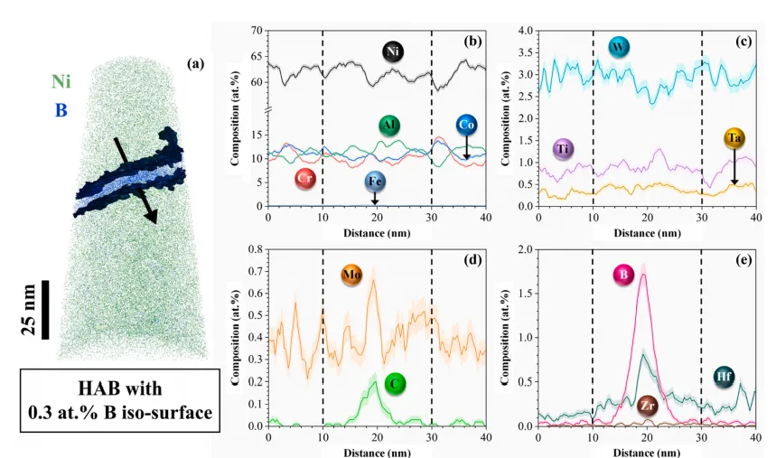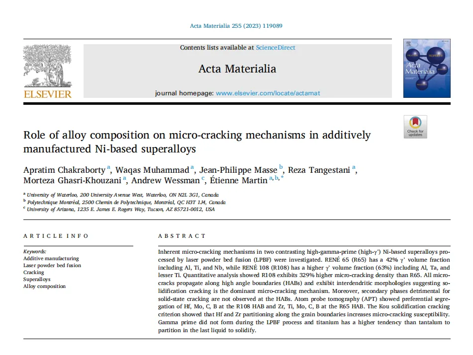 加拿大滑铁卢大学 Chakraborty 等人研究了激光粉末床熔融制备的两种高 γ' 相镍基高温合金的本征微裂纹形成机制。定量分析结果表明,R108 合金的微裂纹密度较 R65 合金高出 329%。所有微裂纹均沿大角度晶界扩展,且呈现枝晶间形貌特征,说明凝固裂纹是其主要的微裂纹形成机制。此外,在大角度晶界处未观察到诱发固态裂纹的第二相。原子探针层析成像(APT)分析显示,R108 合金的大角度晶界处存在铪、钼、碳、硼的择优偏聚,而 R65 合金的大角度晶界处则为锆、钛、钼、碳、硼的择优偏聚。 此研究以“Role of alloy composition on micro-cracking mechanisms in additively manufactured Ni-based superalloys”为题发表在《Acta Materialia》上,原文链接:https://doi.org/10.1016/j.actamat.2023.119089。