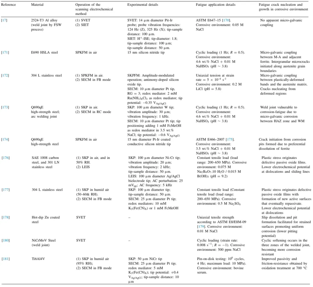 镁及其合金作为最轻的金属结构材料,凭借其低密度、高比强度与比刚度、优异的阻尼性能及生物相容性,在航空航天、汽车轻量化、生物医疗等领域展现出巨大应用潜力。然而,镁合金的电化学活性高,导致其耐蚀性较差,且在循环应力作用下易发生腐蚀疲劳失效,严重制约了其在关键结构部件上的服役可靠性。据统计,镁合金的腐蚀疲劳强度在腐蚀环境中降低40%以上,也迫使人们开始关注镁合金疲劳腐蚀性能的研究工作。当前研究多聚焦于镁合金的单一腐蚀或疲劳行为,而对两者交互作用的微观机制(如微结构演变、局部腐蚀与裂纹萌生的关联)仍缺乏深入理解。传统表征技术难以实时捕捉腐蚀疲劳过程中微米尺度的电化学活性变化。 最近,巴西ABC联邦大学Renato Altobelli Antunes教授等人综述了镁合金腐蚀疲劳行为的最新研究进展,重点探讨了微观结构、环境因素及应力条件对腐蚀疲劳性能的影响机制。该研究通过系统分析不同合金体系(如AZ系列、WE系列等)在模拟服役环境中的腐蚀疲劳行为,揭示了晶界特征、第二相分布及表面处理对裂纹萌生与扩展的关键作用。此外,研究还评估了现有防护技术(如表面涂层、合金化改性等)在延缓腐蚀疲劳失效方面的效果,为开发高性能镁合金提供了重要参考。综述同样指出,当前研究仍存在一些不足,例如对复杂多因素耦合作用下的腐蚀疲劳机制缺乏定量描述,以及对长周期服役性能的预测能力有限。这些问题的解决需要进一步结合先进表征技术与多尺度模拟方法,以推动镁合金腐蚀疲劳研究的深入发展。 首先,作者综述了腐蚀与疲劳协同作用机制及微观结构影响。近年研究聚焦于镁合金腐蚀与疲劳的交互作用机制,揭示了微观结构(晶粒尺寸、析出相、变形孪晶)与局部腐蚀(如点蚀)对疲劳失效的关键影响。例如,AZ31B合金经热处理后晶粒粗化(从35 μm增至250 μm)导致点蚀敏感性增加,而细晶材料(如Mg-Y-0.05Ca合金)因腐蚀产物层更致密,耐蚀性显著提升(原文图1-3)。涂层缺陷(如PEO涂层的孔隙、HA涂层的微坑)成为疲劳裂纹优先萌生位点,降低疲劳极限(如AZ61合金疲劳强度从90 MPa降至80 MPa)。研究还表明,微电偶效应(如Mg2Ca相与基体)、位错堆积及残余应力是局部腐蚀的驱动力,进而加速疲劳裂纹扩展(原文图4-6)。此外,腐蚀介质(如Cl-、H+)在应力集中区的优先吸附加剧了局部电化学活性,导致疲劳寿命显著缩短。 在扫描电化学技术的创新应用方面,作者认为,扫描电化学技术(SECM、SVET、LEIS等)为微观尺度腐蚀-疲劳机制研究提供了新视角,如表1所示。通过SG/TC模式实时监测AZ31合金在模拟体液中H2析出分布,定位高活性腐蚀区域;运用SVET捕捉NaCl溶液中AZ31合金点蚀动态过程,发现阳极电流密度集中区域随腐蚀产物覆盖而迁移;通过LEIS表征揭示了Li2CO3/Mg(OH)2复合涂层缺陷处阻抗变化,发现氢气泡填充缺陷可延缓腐蚀;采用SKP测试发现氢化处理的Mg-Gd-Y-Zn-Zr合金表面Volta电位提升(-1.01 V vs. -2.15 V),验证氢处理对耐蚀性的改善。这些技术为原位解析腐蚀-疲劳协同作用提供了关键数据,如应力集中区电化学活性增强、涂层/基体界面失效机制等。同时也为原位解析腐蚀-疲劳协同作用提供了实验支撑,如应力集中区电化学活性增强、涂层/基体界面失效机制等。此外,结合高分辨率显微技术(如SEM、TEM)和电化学分析,揭示了腐蚀产物层在疲劳载荷下的动态演变过程。 表1 运用扫描电化学技术研究材料腐蚀疲劳的文献 表面处理技术(如PEO、LDH、冷喷涂)在提升镁合金耐蚀-抗疲劳性能方面取得显著进展。制备PEO涂层,能够通过添加ZrO2纳米颗粒封闭孔隙,降低腐蚀速率,但涂层引入的残余应力导致疲劳强度下降15%-17%;利用LDH涂层,Mg-Li LDH层通过离子交换抑制Cl-渗透,结合缓蚀剂(如酒石酸)形成致密腐蚀产物。然而,现阶段对镁合金疲劳腐蚀机制的研究仍存在诸多挑战:微观尺度腐蚀-疲劳动态过程缺乏原位表征手段;涂层缺陷控制、多尺度模拟(如DIDD模型:溶解-电离-扩散-沉积模型)与高通量实验需进一步结合;生物可降解镁合金的长期疲劳-降解协同机制亟待明晰。 未来研究需重点关注以下方向:1. 原位表征技术:开发结合电化学、力学和显微技术的原位测试平台,实时监测腐蚀-疲劳协同作用;2. 智能涂层:开发具有自修复功能的智能涂层(如微胶囊缓蚀剂涂层),以应对复杂环境下的腐蚀-疲劳挑战;3. 多尺度模拟:结合分子动力学(MD)和有限元分析(FEA),预测腐蚀产物层在疲劳载荷下的动态行为;4. 生物医学应用:深入研究生物可降解镁合金在生理环境下的腐蚀-疲劳机制,推动其在骨科植入物中的应用;5. 跨学科融合(如材料科学、电化学、生物医学)将为镁合金腐蚀与疲劳协同作用的研究提供新思路,推动其在航空、汽车、生物医学等领域的可靠应用。 尽管镁合金在轻量化结构应用中展现出巨大潜力,但其腐蚀疲劳行为的研究仍面临诸多挑战。目前的研究主要集中在腐蚀疲劳机制、微观结构对疲劳裂纹萌生和扩展的影响,以及涂层对镁合金腐蚀疲劳性能的改善等方面。然而,现有的研究大多依赖于传统的表征技术,如扫描电子显微镜(SEM)和电化学阻抗谱(EIS),这些技术虽然能够提供腐蚀疲劳后的表面形貌和成分信息,但无法在腐蚀疲劳过程中实时监测局部腐蚀过程。因此,未来的研究应更多地利用具有高空间分辨率的扫描电化学技术,如扫描电化学显微镜(SECM)、扫描振动