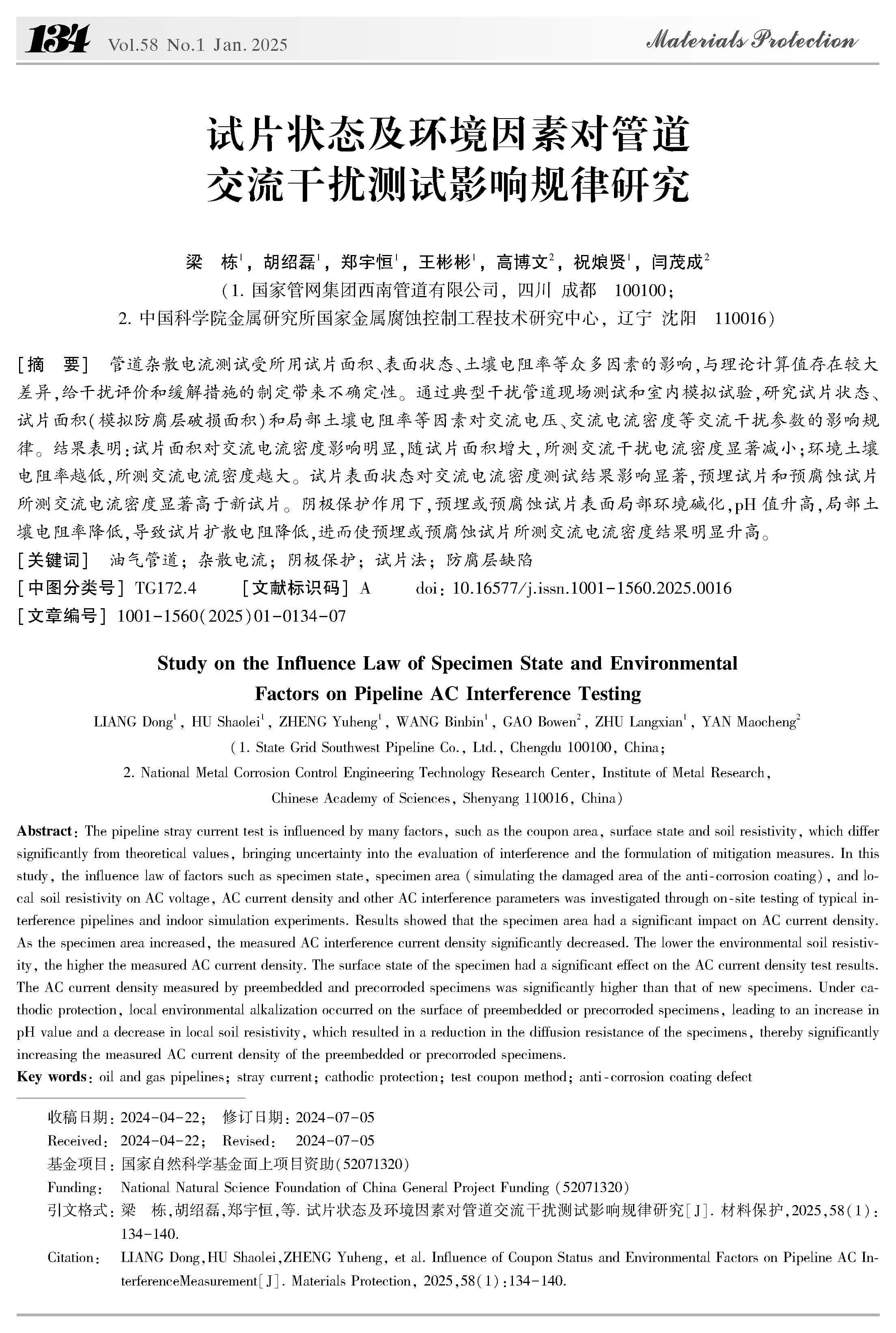 试片状态及环境因素对管道交流干扰测试影响规律研究