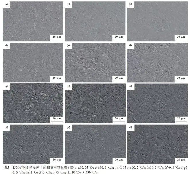 2.1 4330V钢不同冷却速度下的显微组织及显微硬度 图2和图3为4330V钢在不同冷却速度下的金相显微镜及扫描电镜的显微组织。从图中2和图3可以看出,当冷却速度小于0.15℃/s时,组织为贝氏体和少量铁素体,在冷却速度加快的过程中,铁素体含量逐步降低,贝氏体含量则逐步升高,如图2(a)-(c)和图3(a)-(c)所示;当冷却速度增加到0.2~1℃/s时,铁素体消失,组织中出现马氏体,此时试验钢中的显微组织为马氏体+贝氏体,如图2(d)-(h)和图3(d)-(h)所示;当冷却速度增加到3℃/s以上时,组织全部为马氏体组织,如图2(i)-(l)和图3(i)-(l)所示。 图3为4330V钢不同冷却速度下的HV 0.2显微硬度值。从图4中可以得知,随着冷却速度的加快,4330V钢的硬度整体呈上升趋势,当冷却速度≤1℃/s时,硬度会随着贝氏体及马氏体含量的先后增加而迅速上升,当冷却速度≥3℃/s时,组织为完全马氏体,此时硬度基本趋于稳定。 2.2 4330V钢的连续冷却转变CCT曲线 将试样置于室温环境下,以10℃/s的加热速率进行升温,直至温度达到900 ℃。在此升温历程中,试样首先经过Ac1点,对应的温度为703℃,从此时起试样开始发生奥氏体化转变,热膨胀曲线呈现出明显的拐点特征。当温度升高至拐点Ac3点,即769℃时,试样完全奥氏体化。随后对试样进行10min的保温处理,待保温结束后,控制试样的冷却速度,进而获得试验钢在不同冷却速度条件下的热膨胀曲线,相关结果如图5所示。根据切线法得出不同冷却速度下的转变点,依据组织及硬度结果绘制出4330V钢的CCT曲线,如图6所示。从图4中可以发现,若冷却速度低于0.15℃/s,其组织构成是少量铁素体与贝氏体;冷却速率在0.2 ~1℃/s区间时,组织由贝氏体和马氏体构成;而当冷却速度≥3℃/s时,组织全部是马氏体。