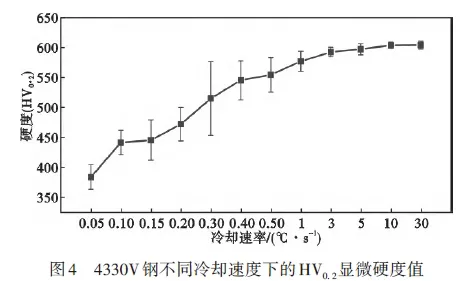 1)采用膨胀法测定4330V 钢的临界转变点为Ac1=703℃、Ac3=769℃、Ms=303℃、Mf=143℃,结合金相-硬度法绘制了4330V钢连续冷却转变(CCT)曲线,其中没有珠光体转变区,仅有铁素体、贝氏体及马氏体。 2)当冷却速度在0.05~0.15℃/s时,4330V钢的组织主要为贝氏体+少量铁素体,属于高温、中温两相复合转变区,硬度值为384~446HV。 3)随着冷却速度提高至0.2~1℃/s 时,4330V钢的组织主要为贝氏体+马氏体,属于中温、低温两相复合转变区,硬度值为472~577HV。 4)当冷却速度增加到3 ℃/s以上时,4330V钢为全马氏体组织,属于低温马氏体转变区,硬度值基本趋于稳定,达到了593HV以上。