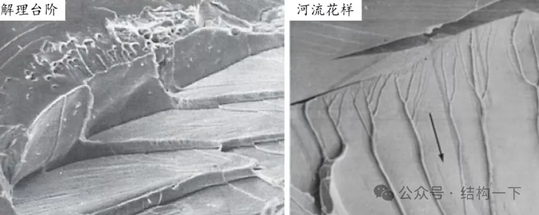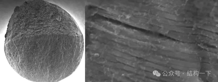 01 |常见的断裂原因 1. 过载断裂 当部件承受的应力超过其抗拉强度时,就会发生过载断裂。 特征:通常有明显的宏观塑性变形(如缩颈),断口呈杯锥状(韧性材料)或较平整(脆性材料)。韧性断口呈暗灰色纤维状,脆性断口则有闪烁光泽。 常见原因:设计强度不足、实际载荷超标或材料强度过低。 同个材料出现两种锻炼,断面A较为平整,故A为初始锻炼位置。 2. 疲劳断裂 这是最常见的断裂形式(占比约80%-90%),由循环交变应力长期作用引起。 特征:断裂是突然发生的,无明显塑性变形。典型断口上有疲劳源区(光滑细密)、疲劳扩展区(常呈现贝壳纹或海滩花样)和瞬断区(粗糙晶粒状)。 常见原因:存在应力集中(如尖角、缺口)、频繁起停或振动,或材料本身疲劳强度不足。 3. 应力腐蚀开裂(SCC) 特征:裂纹形态既有腐蚀特征(如充满腐蚀产物),又有机械断裂特征。主裂纹常有许多分支,呈树枝状。宏观断口较脆,颜色灰暗。 常见原因:材料与所处介质不匹配(如奥氏体不锈钢在含氯离子环境中)、焊接或加工残余应力过大。 4. 氢脆 氢原子进入金属内部导致韧性下降,引起的脆性断裂。 特征:断裂延迟,即在受力后经过一段时间才突然断裂。断口平齐,微观上常呈现沿晶断裂或鸡爪状形态。 常见原因:电镀(如镀锌、镀镉)过程中渗氢、在含氢环境中使用,或焊接湿度过大。 5. 蠕变断裂 在高温环境下,即使应力低于屈服强度,材料也会随时间缓慢发生塑性变形,最终导致断裂。 特征:断裂前有大量塑性变形,断口附近常有许多微小裂纹(蠕变空洞)。宏观断口呈氧化色,表面粗糙。 常见原因:锅炉管道、涡轮叶片等长期在高温下服役。 6. 脆性断裂(解理断裂) 断裂前几乎不产生塑性变形,扩展速度极快,危险性高。 02 |如何分析断裂原因 宏观断口分析(最直观) 微观形貌分析 电镜是追溯裂纹路径的关键工具: 整体追踪:在低倍镜下,先找到断口上放射棱条或人字形花样的发散中心,那个收敛点就是裂纹源。 微观溯流:在高倍镜下,观察解理断裂中的“河流花样”。小支流汇入主流的方向,就是裂纹的局部扩展方向。 区域定位:通常,疲劳源区的断口因反复磨合而最平坦、最光亮;扩展区较平滑,常有疲劳辉纹;瞬断区则最粗糙。这种形貌差异也能辅助判断方 3.成分与金相分析 检查材料化学成分是否符合标准。同时,在断口旁制取金相试样,观察是否存在非金属夹杂物、表面脱碳层、晶粒粗大等微观缺陷。 4.力学性能测试 测试材料的强度、硬度、塑性等指标,并与设计标准进行对比。 5.综合分析 03 |电子显微镜微端断口 1. 韧窝 这是韧性断裂(过载)的典型标志。在电镜下,断口表面看起来像密密麻麻的微小凹坑,也就是微孔聚合的痕迹。 分析要点:韧窝大且深,说明材料塑性好、强度低;韧窝浅而小,则说明塑性较差。若韧窝沿一个方向被拉长,呈抛物线状,还能指示断裂时的剪切方向。 2. 疲劳辉纹 这是疲劳断裂在电镜下的“铁证”。在扩展区,能看到一系列相互平行、略带弯曲的微小条纹,每一条通常代表一次应力循环。 分析要点:发现疲劳辉纹,就可以直接判定为疲劳断裂。通过测量辉纹的间距,还能推算应力大小和扩展速率。需要注意的是,辉纹是微观的,必须用高倍电镜才能看到。 3. 解理特征与沿晶特征 这是脆性断裂的典型表现。 解理断裂:穿晶断裂,形似“河流”或“舌头”。断口平坦,有光泽。河流的汇聚方向,就指向裂纹源。 沿晶断裂:裂纹沿晶界扩展,形似“冰糖”或“岩石”。这通常意味着晶界弱化,可能是由应力腐蚀、氢脆或晶界析出相导致的。