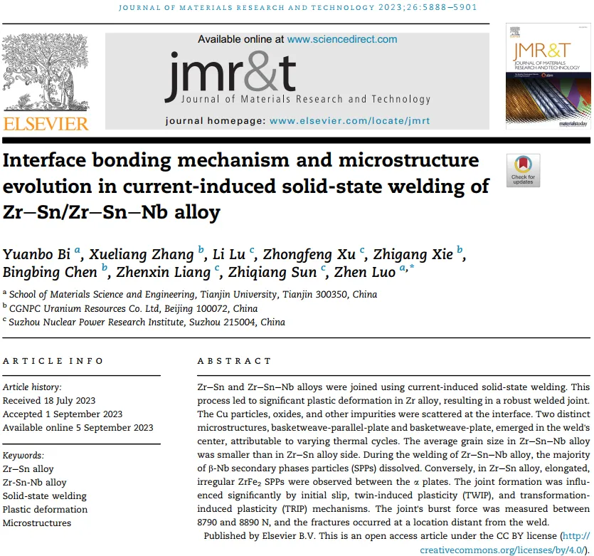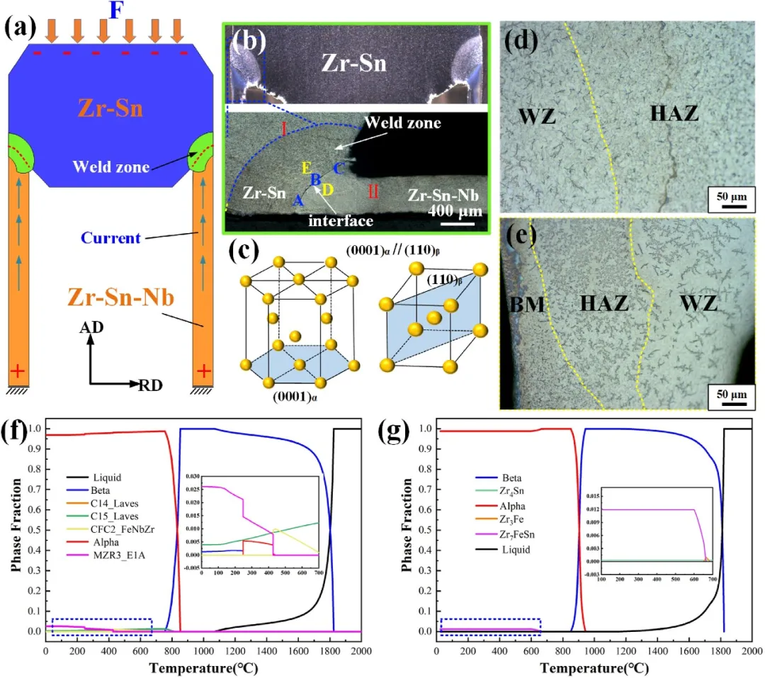 图2展示了接头的宏观与微观特征。图2b的宏观形貌显示接头呈不规则的扇形,无焊接缺陷。图2d和e的局部放大图清晰划分了焊接区(WZ)、热影响区(HAZ)和母材(BM),并直观对比出Zr-Sn合金侧热影响区(HAZ2)更宽。图2f和g的模拟相图则为理解两合金相变温度差异及其对冷却组织的影响提供了理论依据。