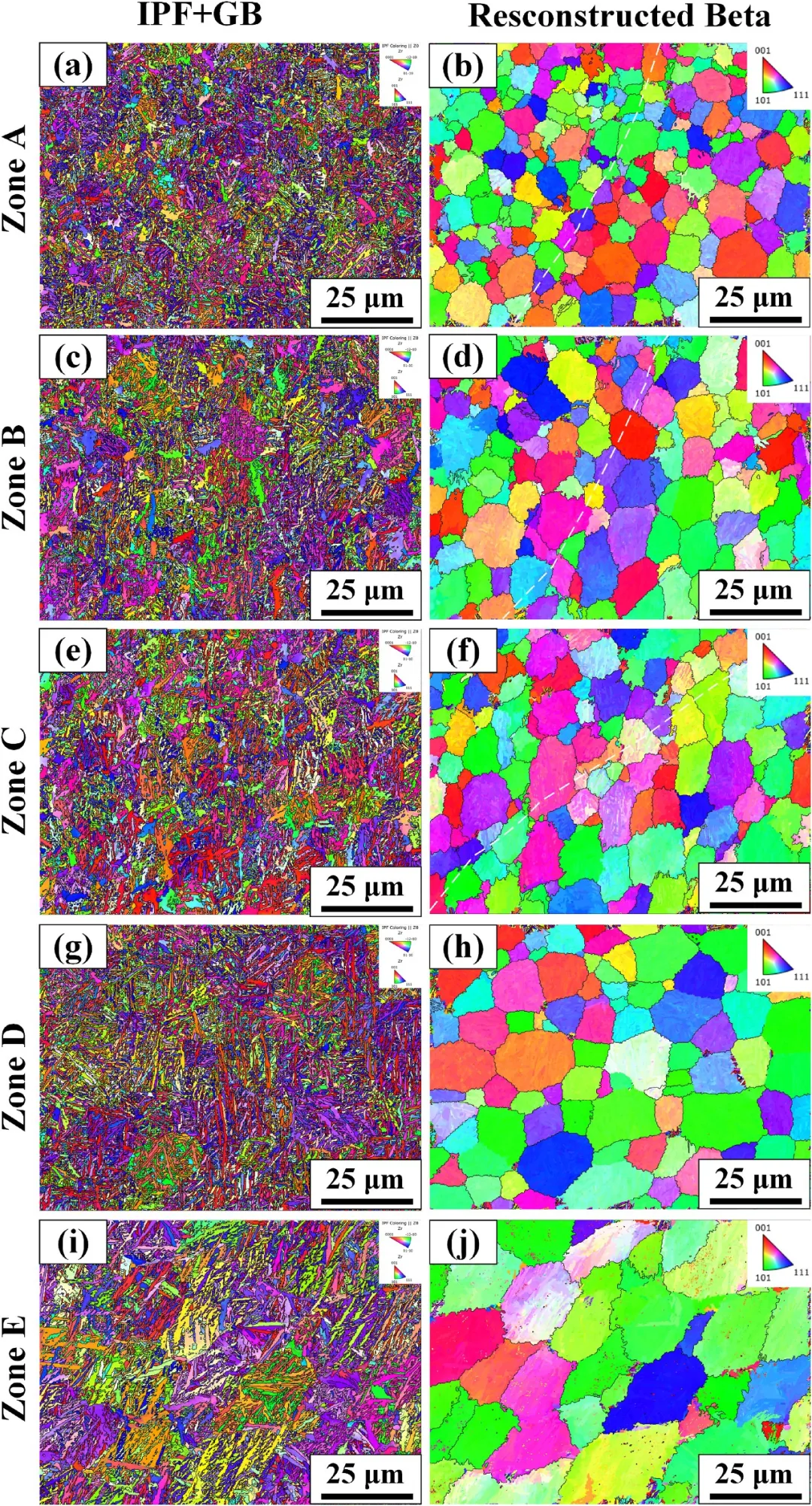 图7聚焦于焊缝不同区域的晶体学特征。图7a, c, e, g, i的晶粒取向图展示了焊缝各区域多样化的微观组织形态。而图7b, d, f, h, j则是基于母相/子相晶体学关系重构出的高温β相EBSD图,直观地揭示了冷却后形成的α板条晶与原始β晶粒之间的强晶体学遗传关系,并定量给出了不同区域β晶粒尺寸的差异,反映了焊接热循环的不均匀性。