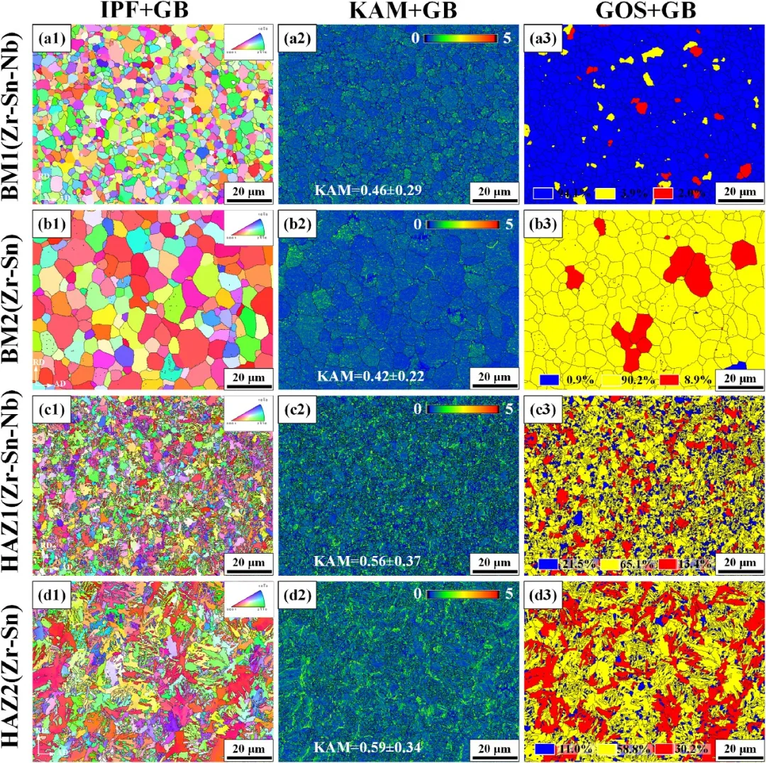 图4利用EBSD技术对比分析了母材与热影响区的微观组织状态。图4a1-d1的晶粒取向图显示,焊接热循环使热影响区发生再结晶,晶粒较母材明显细化。图4a2-d2的KAM图表明,热影响区因焊接应力与变形,其位错密度高于母材。图4a3-d3的GOS图则定量揭示了热影响区,特别是Zr-Sn合金侧,亚结构和变形晶粒的比例显著增加,印证了其在焊接过程中经历了更剧烈的塑性变形。