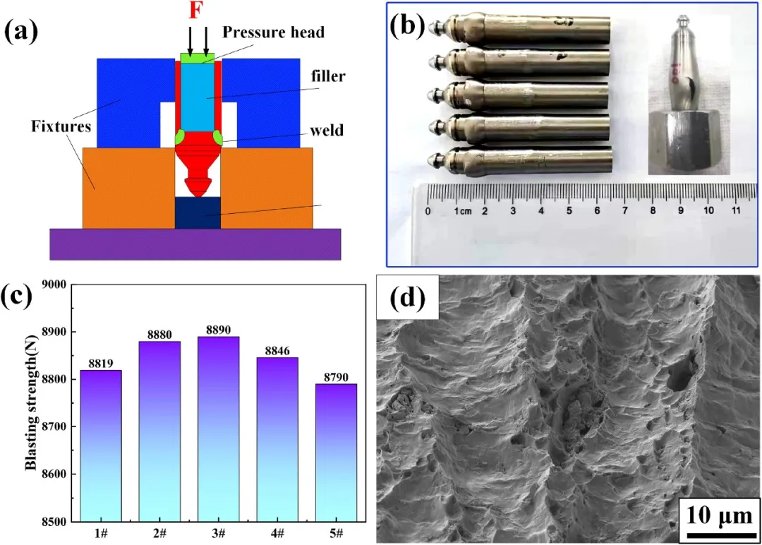 图13用于评估接头的力学性能。图13a的爆破示意图和13b的爆破后样品图表明,断裂发生在远离焊缝的Zr-Sn-Nb合金包覆管侧,证明了焊接接头强度高于母材。图13c的爆破力数据显示其数值稳定在8790-8890 N之间。图13d的断口形貌则主要呈现解理特征,表明其为脆性断裂。