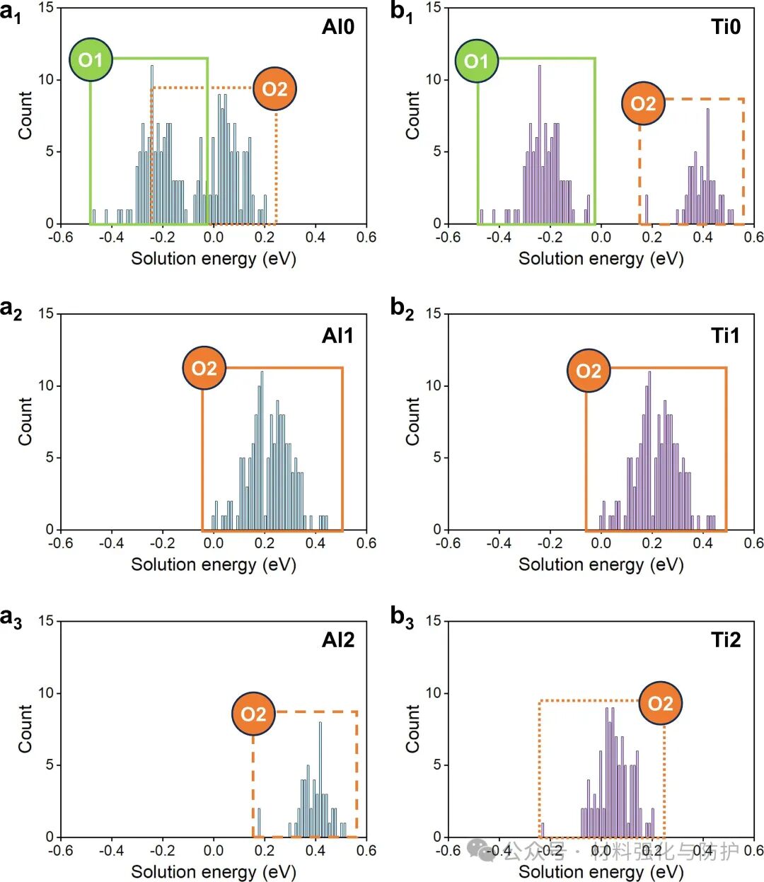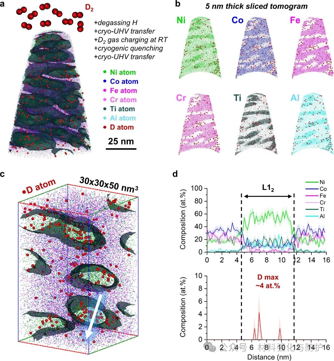 充入的氘原子并非分布在界面,而是高度富集于L12纳米相内部,浓度可达~4 at.%,直接证实了L12相自身强有力的氢捕获能力。在A3B型L12有序晶体中,存在两种八面体间隙位:由6个过渡金属(A位)包围的O1位,和由4个A位原子+2个Al/Ti(B位)原子包围的O2位,L12有序结构导致的晶格膨胀增大了O1位点的间隙体积,使其成为热力学上更稳定的氢“容身之所”,计算发现,O1位点具有平均-0.22 eV的氢溶解能,远低于FCC基体中平均0.03 eV的位点,这种由有序结构本身带来的强氢捕获能力,是抑制氢扩散的关键。