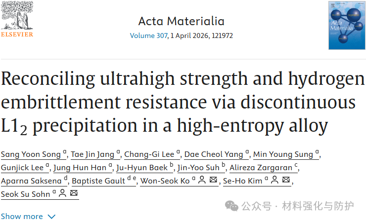 2026年1月28日,韩国高丽大学与马普所等单位联合在材料领域国际期刊《Acta Materialia》上在线发表了题为“Reconciling ultrahigh strength and hydrogen embrittlement resistance via discontinuous L12 precipitation in a high-entropy alloy”的研究论文。团队提出了一种利用不连续L12析出的微结构设计策略,成功在一种CrFeCoNi基高熵合金中,同时实现了约1.73GPa的超高拉伸强度和优异的抗氢脆性能。该合金的氢脆抗性比同基体的单相面心立方参考合金高出约33%,从根本上打破了高强度与氢脆敏感性之间长期存在的传统权衡关系,为氢能基础设施等关键领域所需的高性能结构材料设计开辟了新道路。