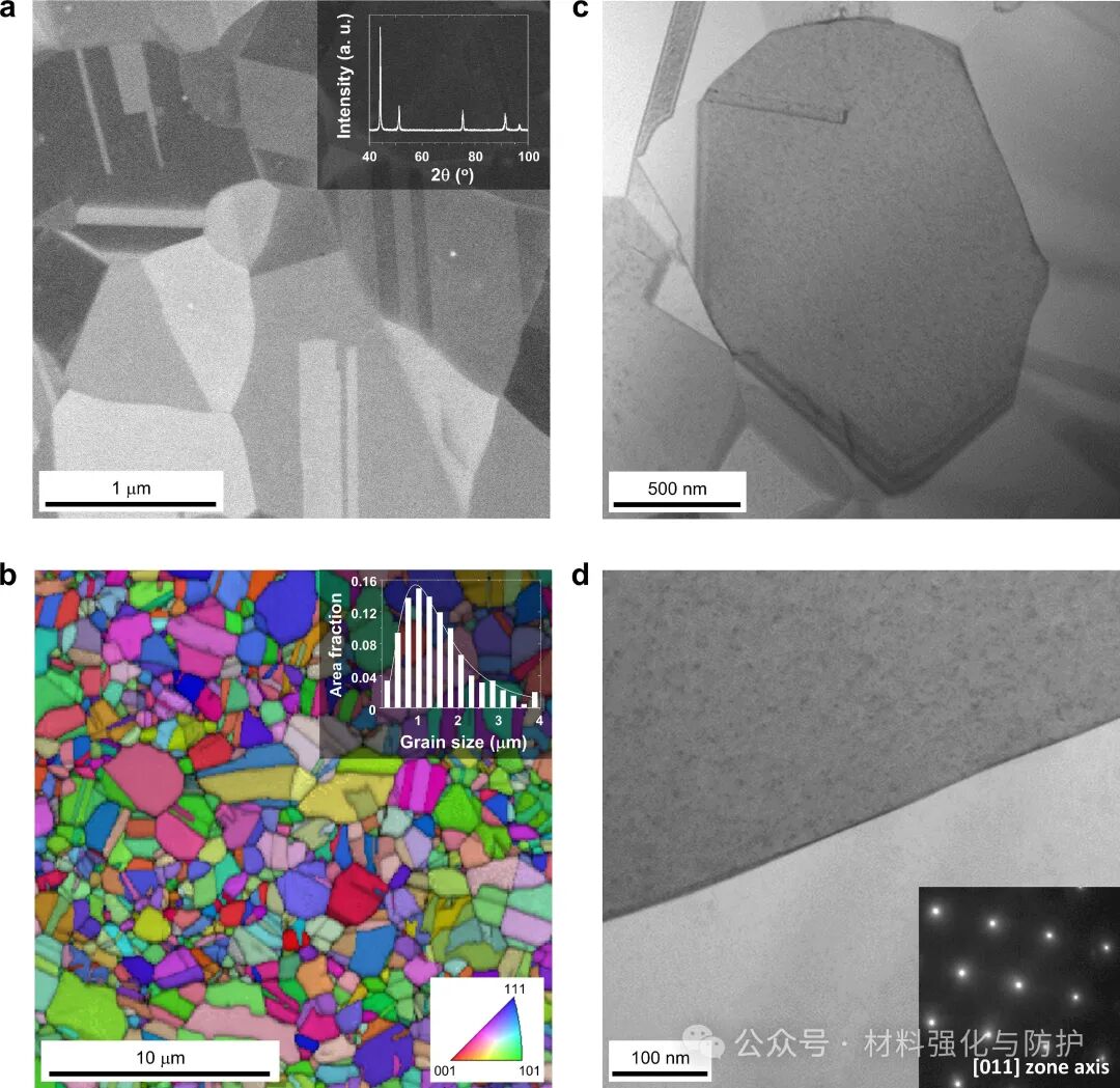 DP合金的微观结构由完全再结晶的面心立方(FCC)基体、平均直径约9.1 nm的L12析出相以及锯齿化的晶界共同构成,Ni、Al和Ti元素在纳米相中富集,形成(Cr,Fe,Co,Ni)3(Al,Ti)型有序L12相,并与基体界面共格,晶格错配度仅0.74%,作为对比的单相FCC参考合金(Ref合金)则呈现规则的等轴晶和平直晶界。