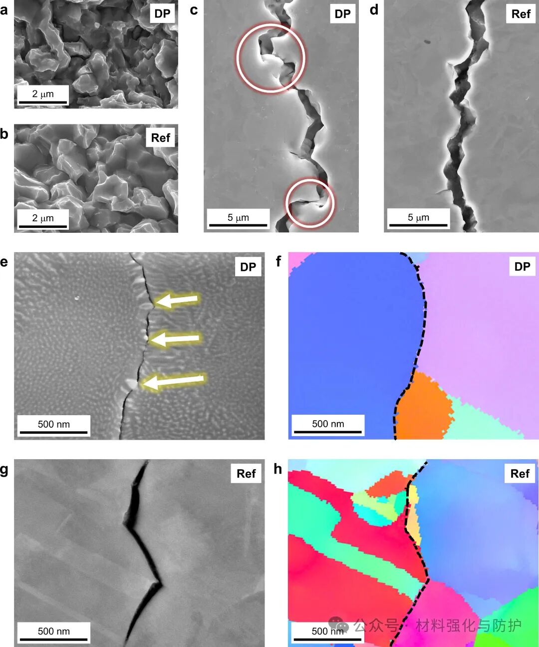 Ref合金的氢致裂纹沿平直晶界迅速扩展,形成光滑的冰糖状断口,而在DP合金中,纳米尺度的锯齿状晶界,迫使裂纹路径变得极度曲折,发生了剧烈的偏转,这种偏转导致裂纹面局部接触碰撞(图6c红圈),产生摩擦和闭合效应,消耗了大量能量,从而提升了裂纹扩展阻力,相比之下,具有球形L12析出相但无锯齿晶界的CP合金,其氢脆敏感性介于两者之间,直接证明了锯齿晶界引发的裂纹偏转是提升抗氢脆性能的关键因素。