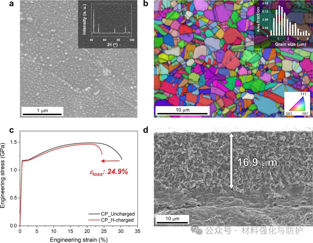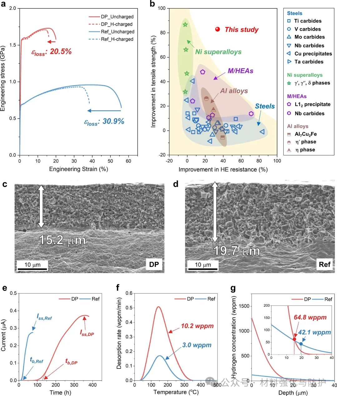 未充氢时,DP合金的屈服强度和抗拉强度分别高达~1570 MPa和~1730 MPa,远超Ref合金(~675 MPa和~960 MPa),为了排除氢扩散差异的干扰,研究采用临界氢浓度(Hcritical)来评估材料本征的抗氢致开裂能力,分析表明,尽管氢在DP合金中渗透更浅(脆化区深度15.2μm vs. Ref合金的19.7μm),但其引发开裂所需的临界氢浓度高达64.8wppm,比Ref合金(42.1wppm)高出约1.5倍,证明其耐受氢损伤的能力更强。