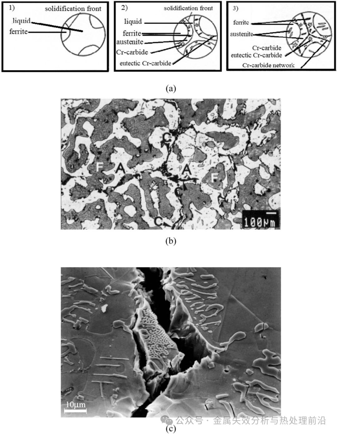 图7. 高碳双相不锈钢铸态组织。(a)W-Nr. 1.4463双相不锈钢的铁素体+奥氏体凝固模式顺序图;(b)W-Nr. 1.4464双相不锈钢经1050 °C 固溶退火30分钟后的微观组织,其中A为奥氏体,F为铁素体,C为M23C6碳化物[27];(c)W-Nr. 1.4464双相不锈钢铸态微观组织,显示一次碳化物处裂纹形核及裂纹沿一次碳化物网络优先扩展。扫描电子显微镜(SEM),二次电子像(SEI)