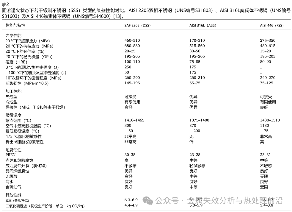 表2对比了SAF 2205双相不锈钢与AISI 316L奥氏体不锈钢(ASS)及AISI 446铁素体不锈钢(FSS)的主要性能,后两者化学成分分别与锻造双相不锈钢中铁素体相和奥氏体相相近。