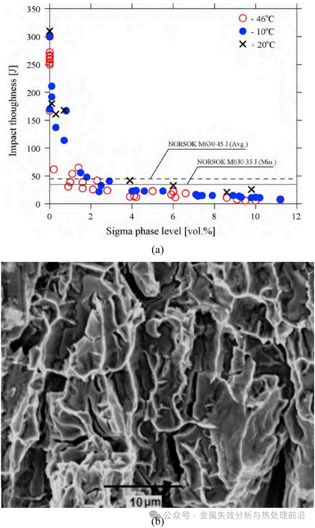 图11. σ相引起的脆化。(a)σ相析出对2205级双相不锈钢在不同测试温度(−46、−10和+20 °C)下夏比冲击试验的影响。图中显示NORSOK M630标准所接受的冲击韧性值(最小值与平均值)。该图表明,仅1%的σ相即可导致脆化;(b)2205双相不锈钢经850 °C、135 min热处理(含约30% σ相)后的V型夏比冲击试样微断口学检验结果,显示高比例脆性断裂及二次开裂。同时观察到奥氏体相的部分延性断裂(见韧窝),扫描电子显微镜(SEM)-二次电子像(SEI)