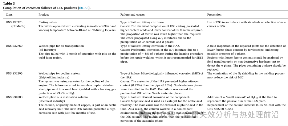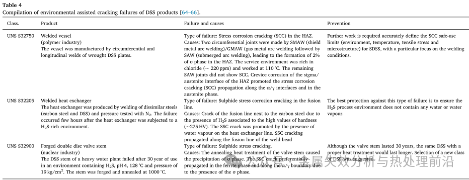3至表6汇总了文献中报道的主要双相不锈钢(DSS)零部件失效分析案例。其中大多数失效发生于焊接接头区域,包括热影响区(HAZ)或熔合区。此外,近50%的失效涉及有害相(通常为σ相)析出。