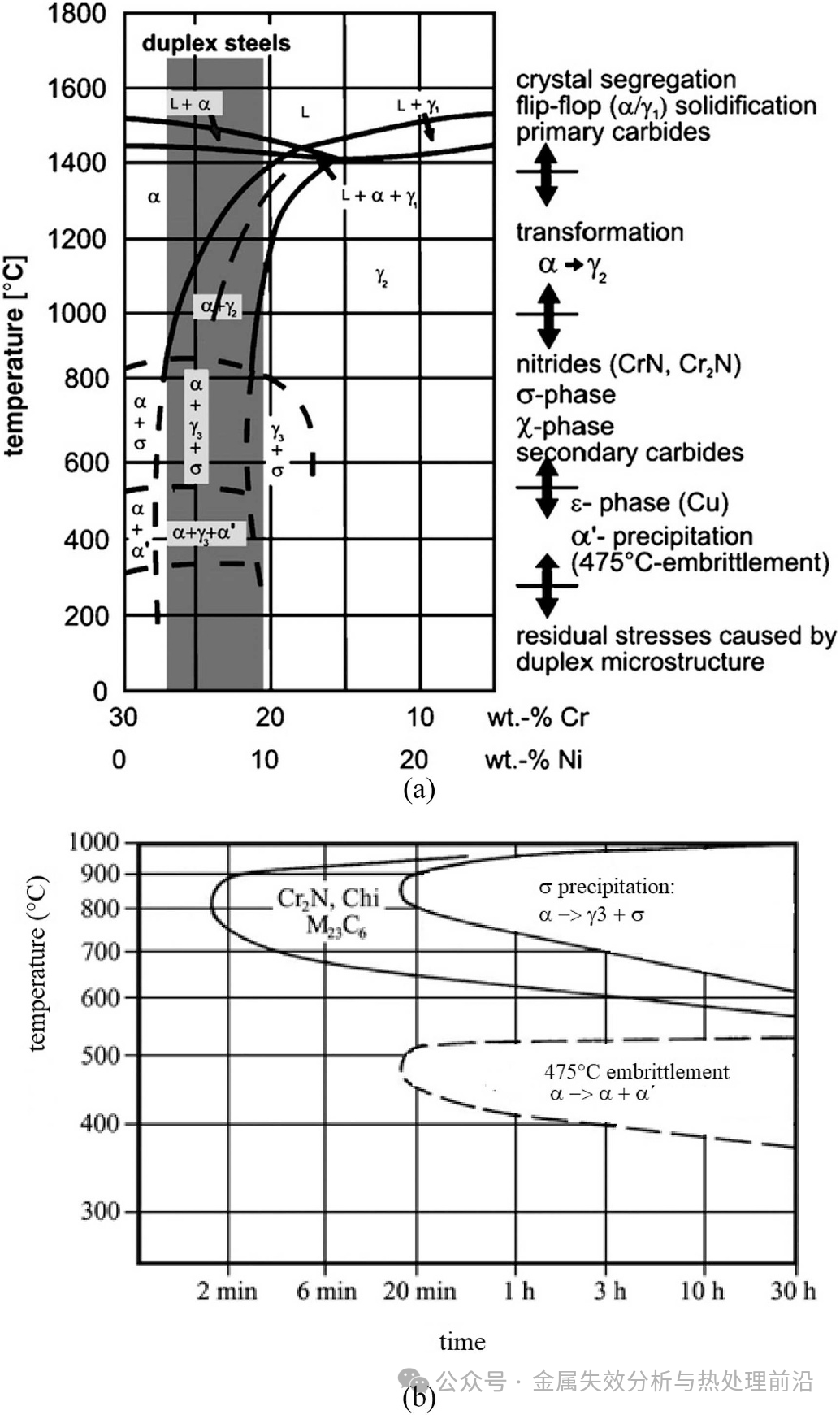 图8. 有害相的形成。(a)Fe-Cr-Ni体系双相不锈钢的伪二元相图,标示了不同温度下σ、χ、M23C6及Cr2N等稳定相的形成。γ2与γ3 用于区分固态中形成的二次与三次奥氏体相,而γ1则标识凝固过程中形成的一次奥氏体相[30];(b)示意性TTT图,显示X2 CrNiMoN 22 5(AF 22)双相不锈钢中Cr2N、M23C6、χ、σ、三次奥氏体及α′相(475 °C脆化)析出的动力学行为