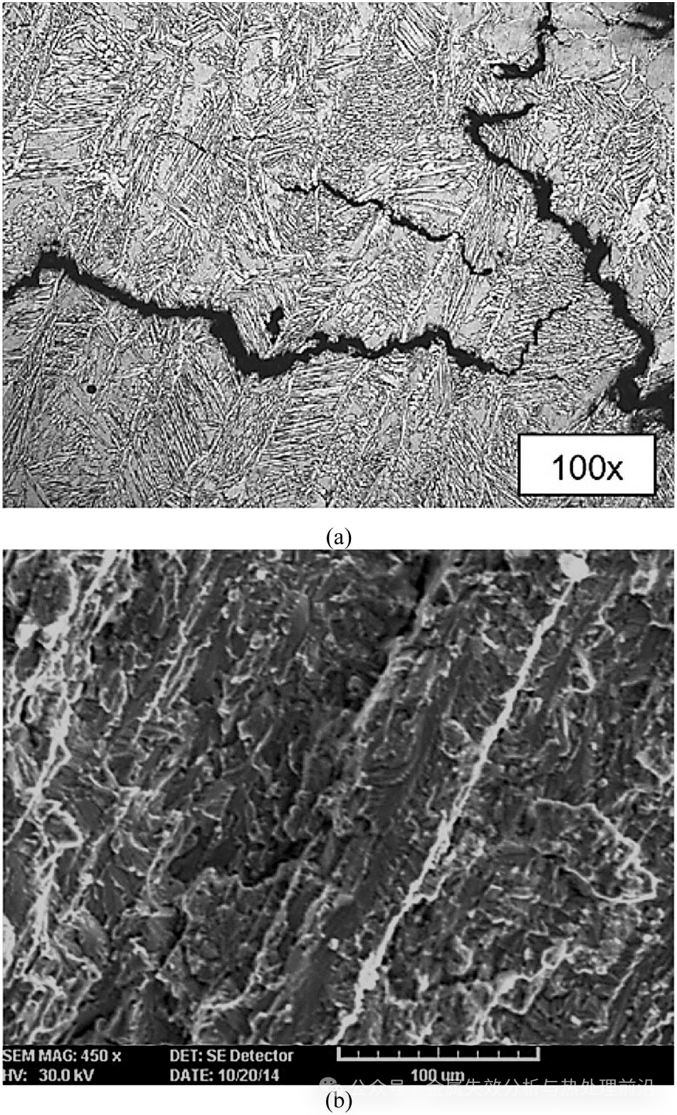 另有一例中,疲劳裂纹萌生于热影响区(HAZ),系因该区域奥氏体相比例偏高且显微组织中析出σ相所致,进而导致构件发生脆性断裂(见图20a与20b)。