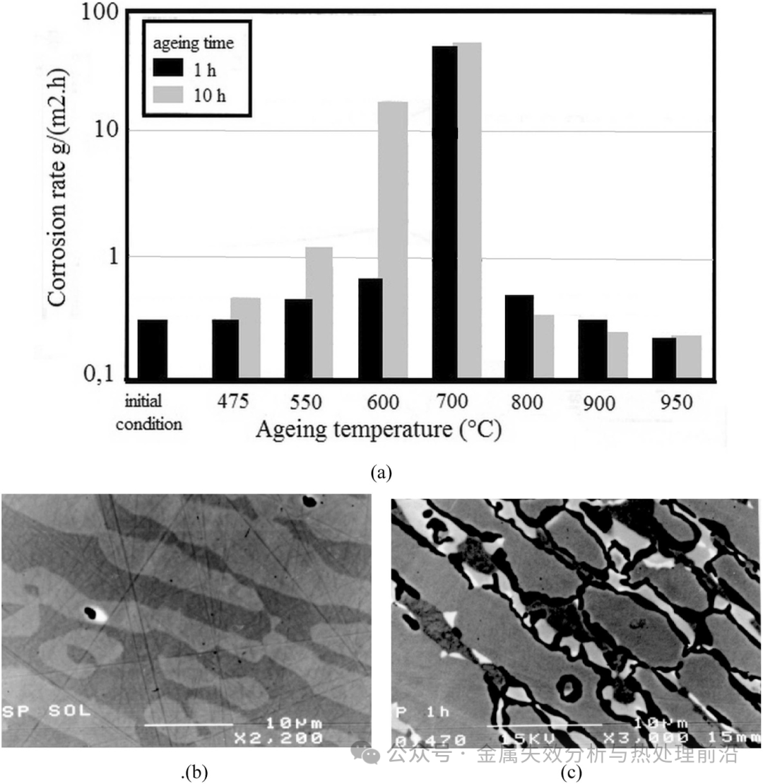 图12. σ相与腐蚀。(a)σ相析出对1.4462双相不锈钢在Huey腐蚀试验(沸腾60%硫酸)中全面腐蚀的影响。该双相不锈钢在475至950 °C范围内经1至10 h热处理。最大腐蚀速率出现在700 °C、仅热处理1 h后,以及600 °C、热处理10 h后;(b)固溶退火AV2205双相不锈钢(不含σ相)在循环动电位极化试验中于奥氏体相上形成的腐蚀坑(见黑色斑点)。扫描电子显微镜(SEM),二次电子像(SEI)[38];(c)AV2205双相不锈钢经850 °C、1 h热处理后(含σ相)在奥氏体/铁素体界面处发生的局部腐蚀(见连续黑色条带),循环动电位极化试验。扫描电子显微镜(SEM),二次电子像(SEI)
