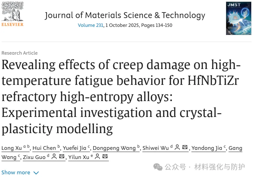 JMST | 实验研究和晶体塑性模拟揭示蠕变损伤对HfNbTiZr耐火高熵合金高温疲劳行为的影响