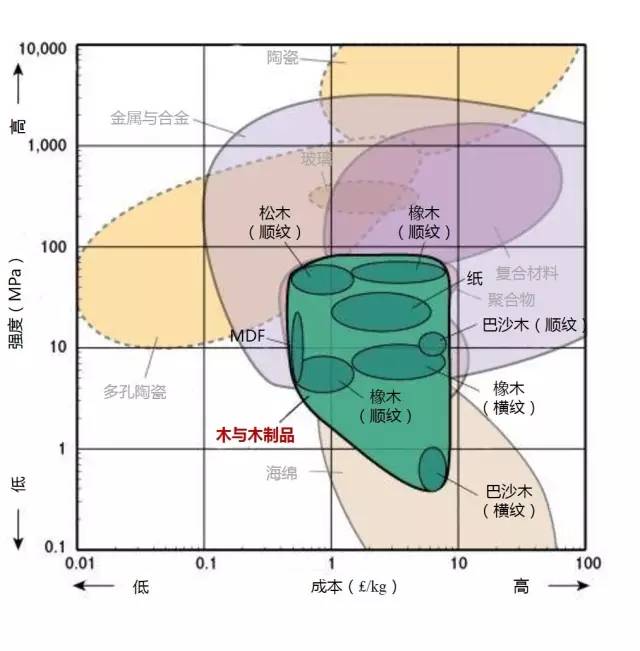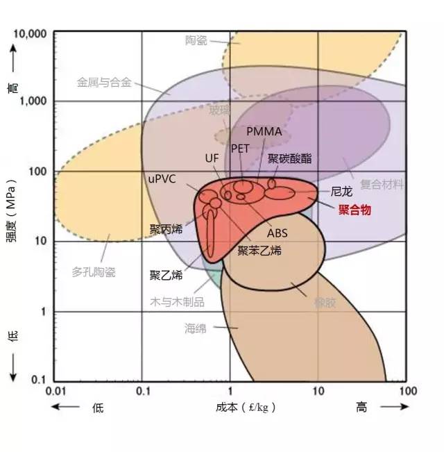 2.许多应用要求材料具有较高的强度,如螺丝刀、安全带等,但是他们通常都比较贵,只有极少数的材料能同时满足强度和成本的要求(左上部分)。