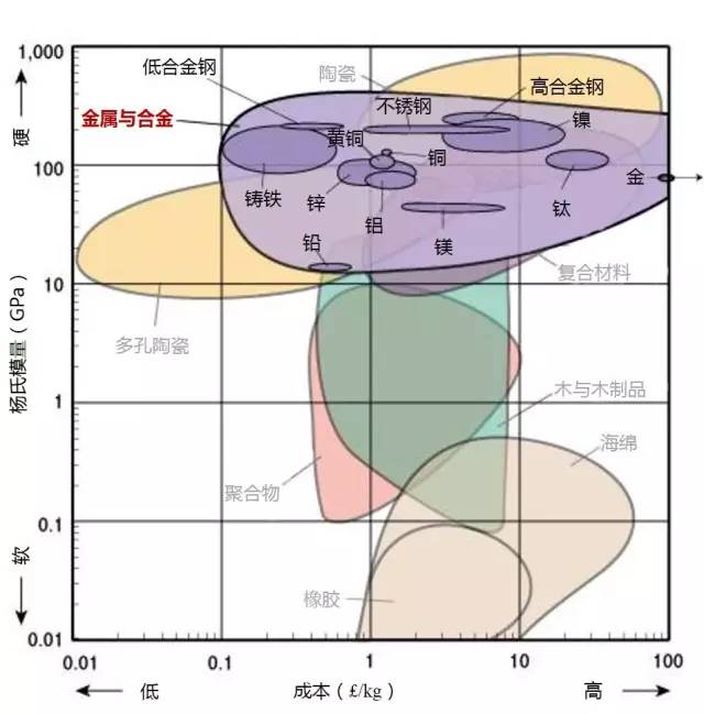 3.需要廉价且坚硬的材料,则选择图表左上方的材料,大多为金属和陶瓷。