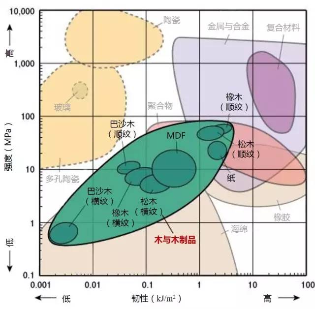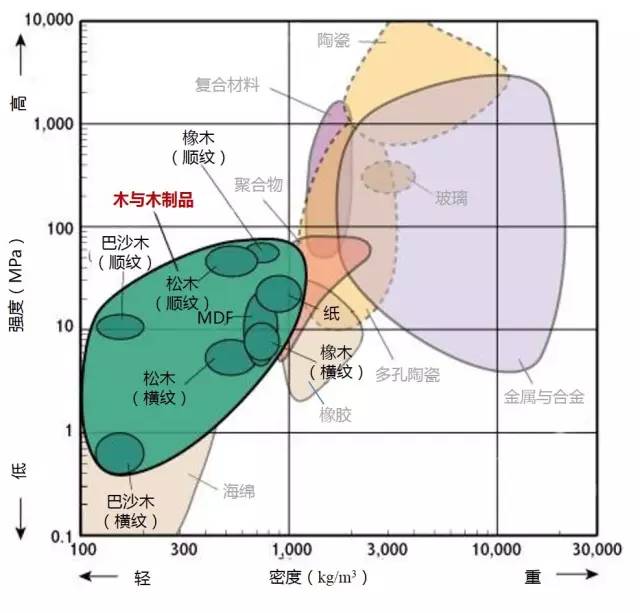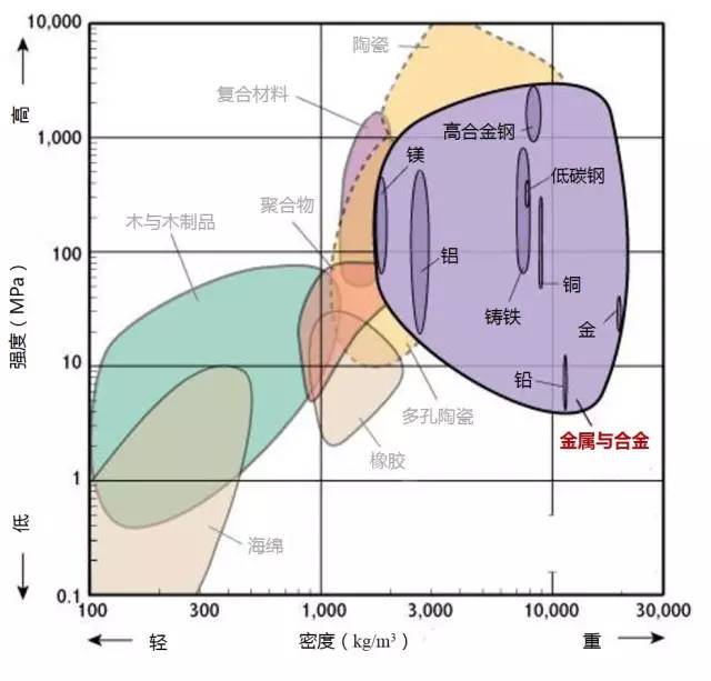 2.高强度且低密度的材料位于图形的左上部分。
