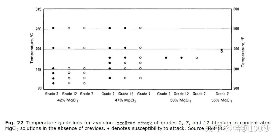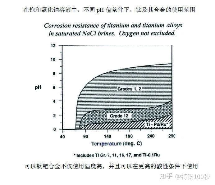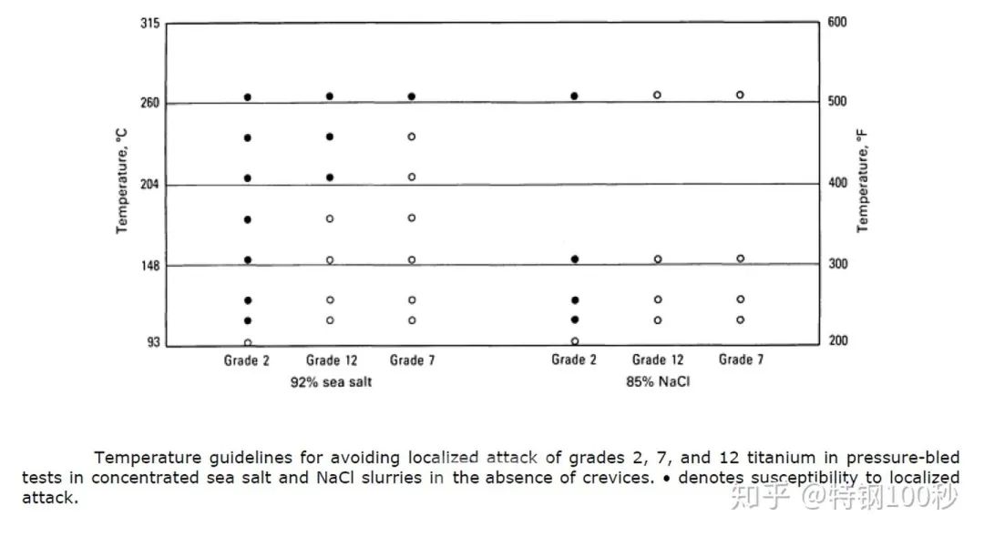 海水的盐度通常小于5%,根据长期的实验和实际使用,认为纯钛可以在120度以下的海水中安全使用,但温度再升高就有可能发生缝隙腐蚀,继续升高就有可能发生点蚀。
