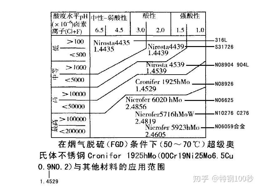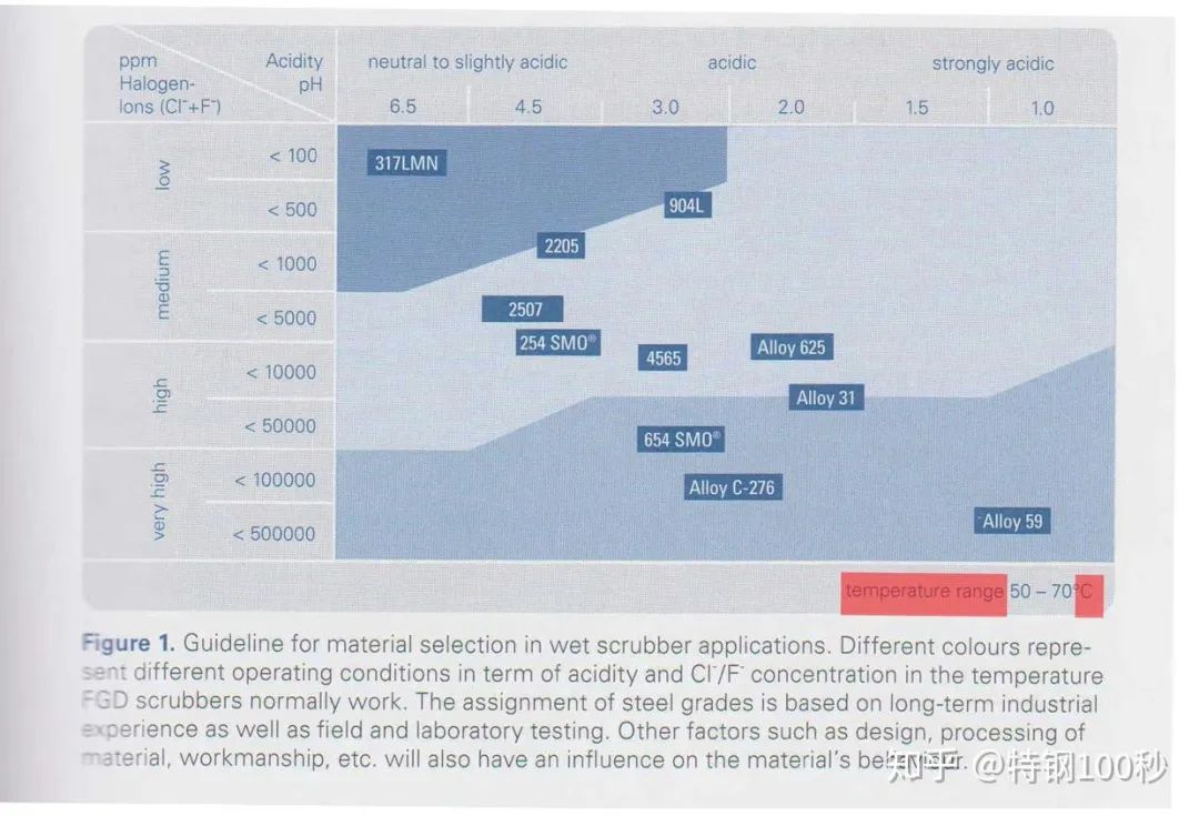 下图更直观,50~70度温度下,按照酸碱性和氯离子浓度直接找到对应材料即可。