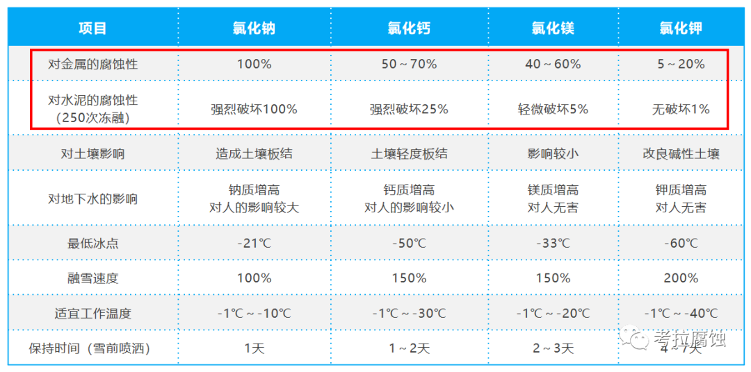 一类是以醋酸钾为主要成分的非氯化物类有机融雪剂,该类融雪剂融雪效果好,基本没有腐蚀损害,但价格高,一般用于机场、保护区等区域。 另一类则是以“氯化物类”为主要成分的无机融雪剂,如氯化钠、氯化钙、氯化镁、氯化钾等。其价格便宜,但对大型公共基础设施腐蚀较为严重。常见的融雪剂就属于此类,用的最多的是含有杂质的氯盐(即工业盐)。几种氯化物融雪剂的性能比较如下:
