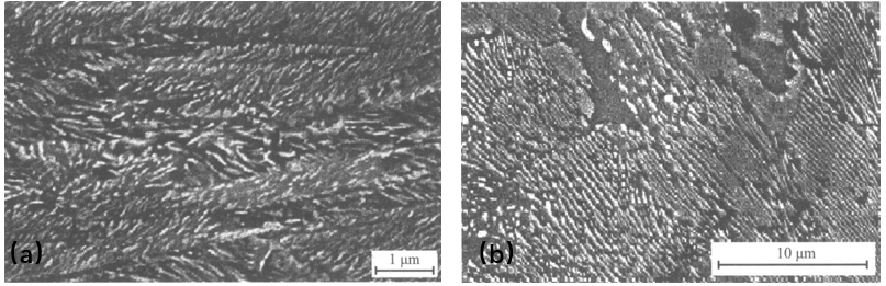 图4 (a)GCr15钢的羽毛状上贝氏体组织 ;(b)共析钢的片状珠光 体组织(SEM)