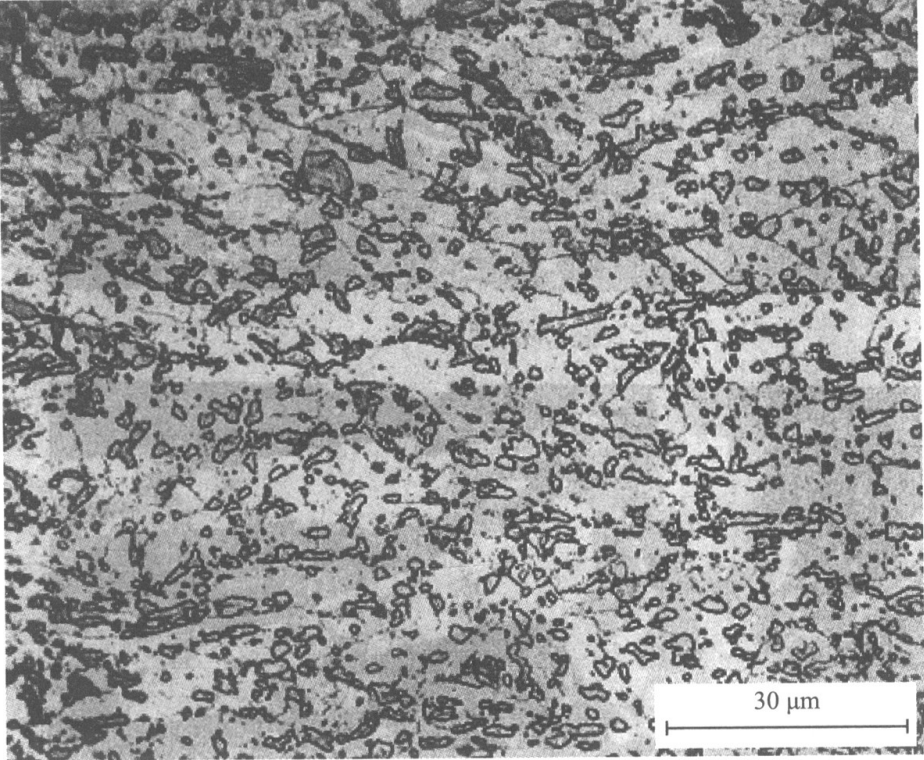 图25为71Crl锯片用钢的锻后珠光体组织。该钢的主要成分为:w(C)=0.75%,w(Mn)= 0.64%,w(Cr)=0.39%,确认该钢是含有少量合金元素的共析钢。该钢锻造后空冷可得片状珠光体组织,由铁素体+渗碳体两相组成。