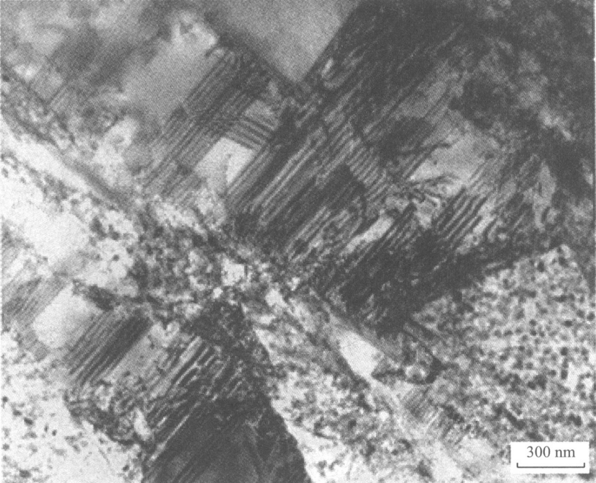 奥氏体的层错能较低,因此,奥氏体中还存在层错亚结构。层错是晶体缺陷,但层错能较低,可在一定条件下稳定存在。例如,将含氮奥氏体不锈钢样品加热到1100℃,保温30min,水冷进行固溶处理,在透射电镜下观察发现,含氮奥氏体晶粒中存在大量层错。