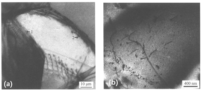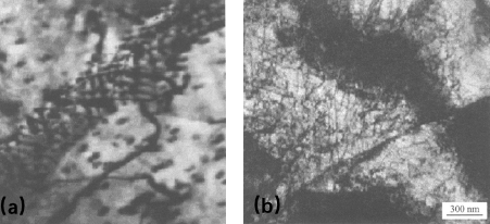 图 15 汽车用钢的铁素体中的亚结构(TEM):(a)铁素体小角度晶界;(b)铁素体晶粒中的位错线