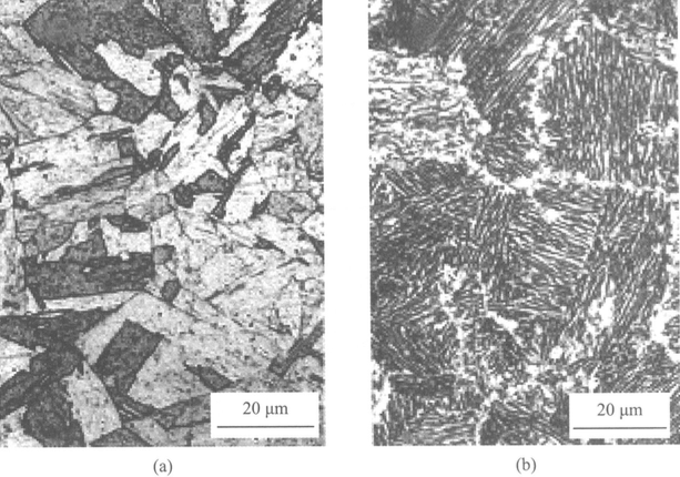 图5 下贝氏体与片状马氏体的比较(OM):(a)GCr15钢的针状(或片 状)下贝氏体组织;(b)低碳钢的渗碳层局部的淬火马氏体组织