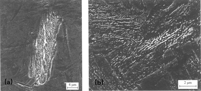 图17(a)所示为高碳钢(0.75%C,0.65%Mn,0.15%Si,0.39%Cr)的片状珠光体组织。在扫描电镜下可观察到渗碳体片层的立体形貌像,其照片是二次电子像,凹下部位呈灰黑色,较为凸出的部位是渗碳体,呈灰度很小的灰白色。图17(b)所示为Fe-2.6%Cr-0.96%C合金的珠光体组织的透射电镜照片,两相的灰度正好与图(a)相反,灰白色是铁素体片,黑色线条区域是渗碳体片。这是电子束衍射成像的结果。在电子束照射下,铁素体相符合布拉格衍射条件,呈白亮色,而渗碳体相不符合布拉格衍射条件呈黑色。