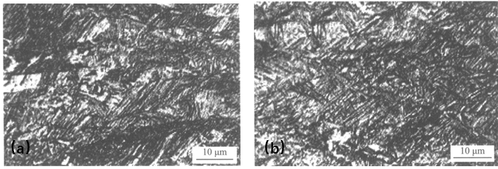 下贝氏体可在奥氏体晶界形核,有时也在晶内形核,具有片状或针状特征。 针状下贝氏体与片状马氏体相似,图4(a)所示为GCr15钢在 950℃加热奥氏体化,然后于300℃等温,采用光学显微镜观察到的针状(或片状)下贝氏体组织 ,酷似片状马氏体。图4(b)所示为低碳钢的渗碳层局部的淬火马氏体组织(自回火),可见,金相形貌非常相似,都有残留奥氏体(灰白色部分)。