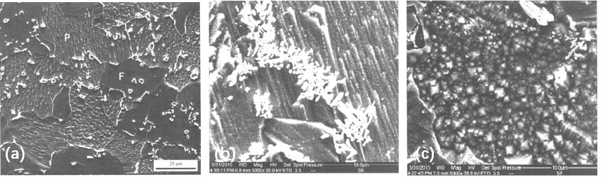 其灰黑色区域是先共析铁素体(在图中标注为F),白亮的颗粒是碳化物。在灰黑色基体上分布着呈短棒状或颗粒状的灰白色相,此区域是珠光体,也是一种类珠光体组织(在图34a中标注为P,a)所示的珠光体呈长柱状,碳化物尺寸较长b)为这些长柱状的碳化物的横截面形貌。