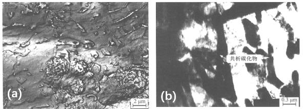 图17 (a)高碳钢的片状珠光体组织(SEM);(b)Fe-2.6%Cr-0.96%C合金的珠光体组织(TEM)