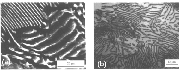 图1 两种合金的片状组织的比较 :(a)Cu-11.8%Al合金的共析组织(OM);(b)T8钢的片状珠光体组织(OM)