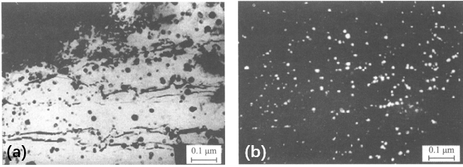 可见,在灰白色铁素体基体上分布着形状不规则的碳化物,有片状的,也有颗粒状的。图(b)所示为该钢的薄膜样品的透射电镜照片,可见,白亮色的(灰度近于 0%)是铁素体基体,碳化物呈黑色或灰黑色(灰度不等,有时在90%以上)的不规则片状。