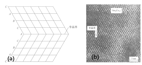 图9 (a)面心立方晶体中的孪晶关系;( b)Sm-Co合金的高分辨晶格像(HRTEM)