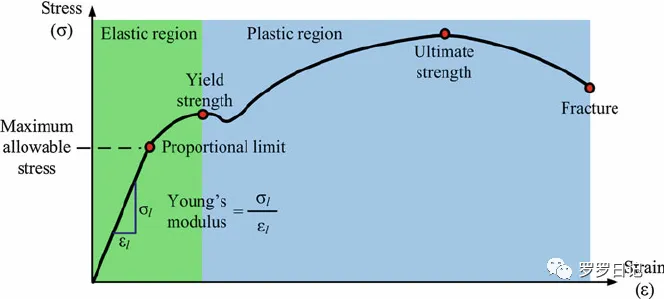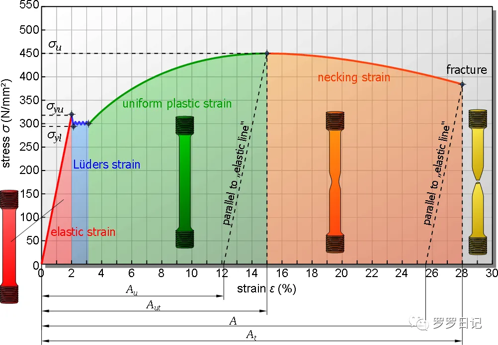 图4:应力应变阶段图,从左到右依次经过比例极限,屈服点,抗拉强度,断裂。从屈服点到抗拉强度之间的塑性变形又叫应变硬化(加工硬化),抗拉强度之后的变形因为是不均匀变形,所以叫缩颈。