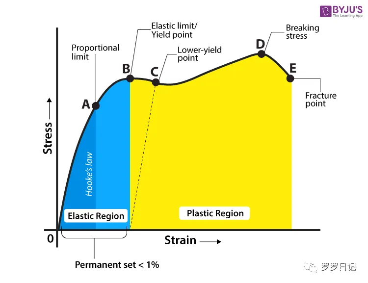 图5:应力应变区域及阶段图,蓝色区域是弹性变形区域,黄色区域是塑性变形区域。变形过程依次经过:比例极限A(胡克定律适用于此点之前的变形),弹性极限B/屈服点,低屈服点C,抗拉强度D,断裂点E。