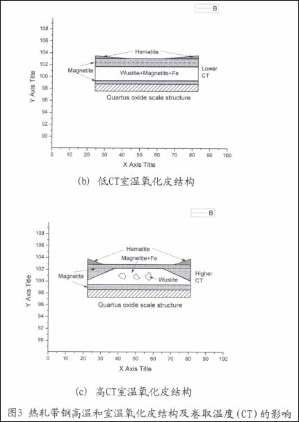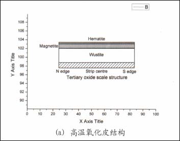 传统上,将精轧中形成的氧化皮和带钢表面在室温下的最终氧化皮统称为三次氧化皮。然而带钢卷取后由于张力的作用使相邻钢板的中间部位紧密贴合,而钢板边部由于沿板宽方向的凸度造成边部减薄形成缝隙,因此钢卷冷却过程中钢板的中间部位和边部与空气的接触程度不同,从而持续的氧化反应程度不同。在一定的温度以上,边部的氧化会继续发生,而中间部位由于缺氧主要发生高价氧化物还原,进而发生氧化物的先共析反应和迟滞共析反应,导致高温下形成的FeO发生相变而形成不同组成和结构的最终氧化皮。
