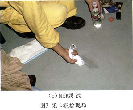 无机硅酸锌涂料的完工报检是指第一度喷涂及修补、修喷后,整舱(包括舱底)的漆膜检查,此时的漆膜表面应无明显的缺陷,无漆雾、针孔、龟裂及流挂等,膜厚达到规定要求,完工合格后需整舱喷淋淡水图2三度漆预涂及清洁(图3a),通自然风,以促使无机锌的固化,要保证漆膜表面的湿润但不能积水,保证舱内的通风。常温状态下,良好的保湿及通风,12~24h后,无机锌就能固化,舱室干燥4h后就可着手做MEK测试或硬币刮擦测试(图3b)。MEK测试合格后方能拆除脚手架,如果测试不合格,说明油漆还未固化,仍需给水以帮助固化直至MEK测试合格,拆架前擦去所有记号笔痕迹并用记号笔在舱底明显框出所有管脚位或待处理区域。