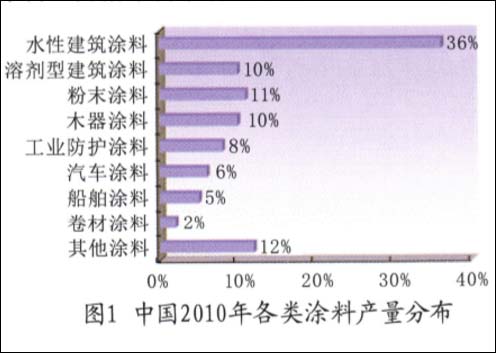 我国自2009年起,已成为全球涂料生产、消费第一大国,涂料工业发展迅速。2010年中国各类涂料产量分布图如图1所示。从图1中可以看出,建筑涂料已占据涂料市场的半壁江山。