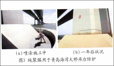 Qtech-412纯聚脲材料具有优异的耐候、耐紫外线老化、高强度、高延伸率、抗冲击、耐磨损等综合性能,在海洋大气腐蚀环境下能长久、有效地保护钢、混凝土等基材。为此,2011年7月青岛海湾大桥沧口航道桥主桥墩的承台,采用了Qtech-4.2纯聚脲防护技术,喷涂施工现场如图3(a)所示。