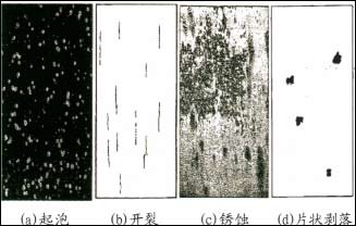 标准己规定用ISO 4628评价上述涂层失效现象的级别,起泡、开裂、锈蚀和片层剥落四种失效现象的3级标识如图1所示。