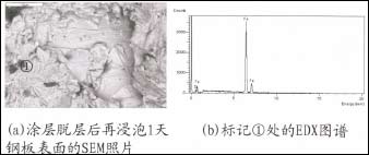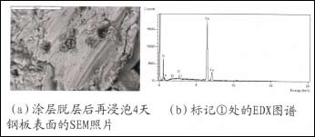 图5(a)为涂层浸泡4天后脱层的SEM照片,从照片中可以明显看出,钢材基体表面己有明显腐蚀产物形成,说明基体己经开始发生腐蚀反应。